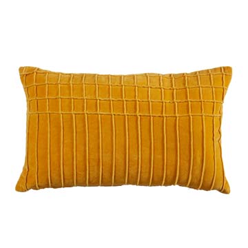 The Aura decorative cushion is made of velvet with a modern grid pattern on the front. The grid consists of a relief of vertical lines with a few horizontal lines at the top creating a block shape. The colour of the decorative cushion is yellow ochre and both the front and back are made of 100% cotton velvet. The dimensions are 30 x 50 cm. This cushion has a zip at the bottom and comes with a springy polyester inner cushion.