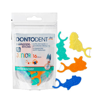 The DONTODENT Dental Floss Sticks Junior, with their child-friendly handle in a funny animal shape, are easy to handle. The particularly gentle dental floss is tightly stretched, which allows easy cleaning of the interdental spaces, even in posterior tooth areas. Helps prevent caries and gum problems with regular use.