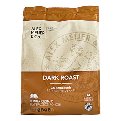 Alex Meijer & Co. Excellent Quality. Dark Roast 36 coffee pods.Dark roasted 4/5 strength. Our Alex Meijer coffee pods provide a delicious cup of coffee from ground Arabica and Robusta coffee beans from Brazil, Central America and East Asia