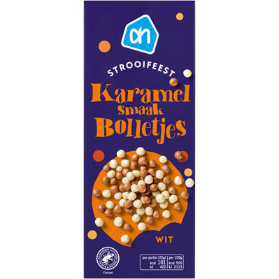 Crispy grain balls of which 60% coated with 45% caramel flavored layer and 40% coated with 31% white chocolate.