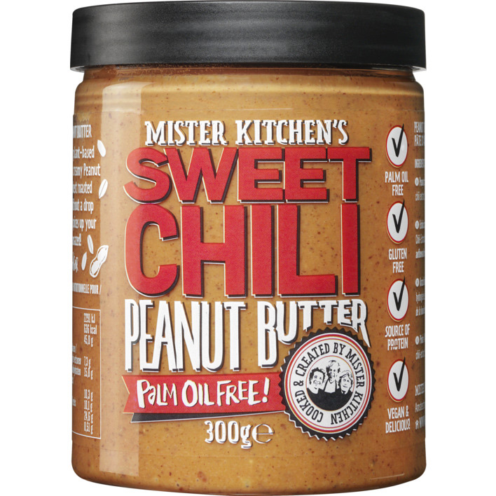 Mister kitchen makes the creamiest peanut butter without palm oil in the tastiest flavors. The sweet spiciness of our peanut butter sweet Chili makes your sandwich, dish or sauce sparkle deliciously! Creamy without palm oil Vegan, gluten-free, no preservatives Only from the best argentinian peanuts Rich in fiber. Source of proteins, vitamins and minerals. Peanut butter dessert recipes can also be made. Try this homemade peanut butter from mister kitchen a real dutch peanutbutter company