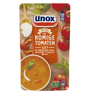 Unox creamy tomato cream soup in a bag can be put on the table in no time and is good for more than 2 bowls of soup. Unox creamy tomato cream soup in bag contains about 188 grams of vegetables per bowl Delicious vegetarian soup with sun-dried tomato, mascarpone and basil Heat the tomato soup in a pan or in the microwave for 2.5 minutes Ready in an instant and good for more than two bowls of soup