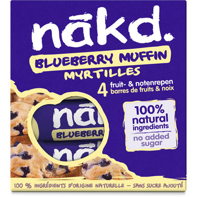 Only fruit and nuts together in a delicious and natural bar. Nakd blueberry muffin bars are simple, responsible and above all very tasty! Contain only fruits and nuts, nothing else! Made from 100% natural ingredients, no added sugars Gluten-free, dairy-free, vegan and kosher Your daily healthy snack, ideal for on the go and in between
