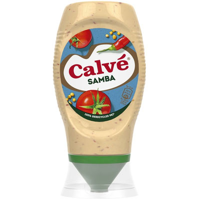 Calve samba sauce is a slightly sweet and creamy sauce with a spicy taste, delicious with steak, chicken or vegetables. Calve samba sauce Tastes great with a steak, chicken or vegetables Samba sauce is a slightly sweet and creamy sauce with a spicy taste The sauce is packed in a squeeze bottle, made from 99% recycled PET plastic Indispensable during gourmet and delicious at the barbecue