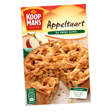Appeltaart Met Koopmans Appeltaart bak je eenvoudig de enige echte Hollandse appeltaart. Deze heerlijke appeltaart is geschikt voor ieder moment. Voeg aan de mix een ei en boter toe. Kneed het tot een deeg en bekleed met 2/3 van het deeg de springvorm. Je vult de appeltaart met een appelmengsel van fris-zure appelblokjes, kaneel en rozijnen. Van het resterende deeg maak je deegreepjes die je kruislings over de appeltaart legt. En de appeltaart is klaar om de oven in te gaan!